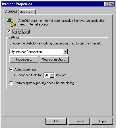2a. If you have installed Microsoft Internet Explorer 2.0, you will see the dialog box below. Put a check mark next to 'Use AutoDial' and then select the Dial-Up connection that you use to connect to the Internet.