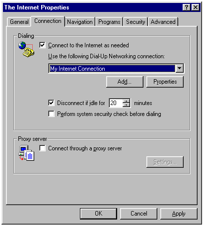 Put a check next to 'Connect to the Internet as needed' and select the 'Dial-Up Networking connection' that you use to connect to the Internet.
