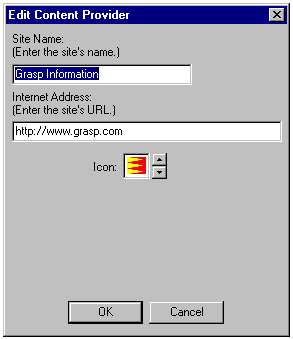 The Edit Content Provider Dialog allows you to modify the name or Web address (URL), or Icon Selection for a Content Provider. From the list at the bottom of the page, click on a topic to get more details. |