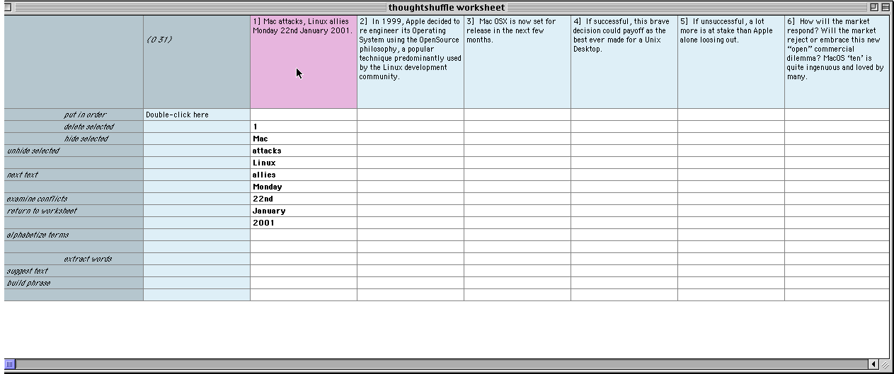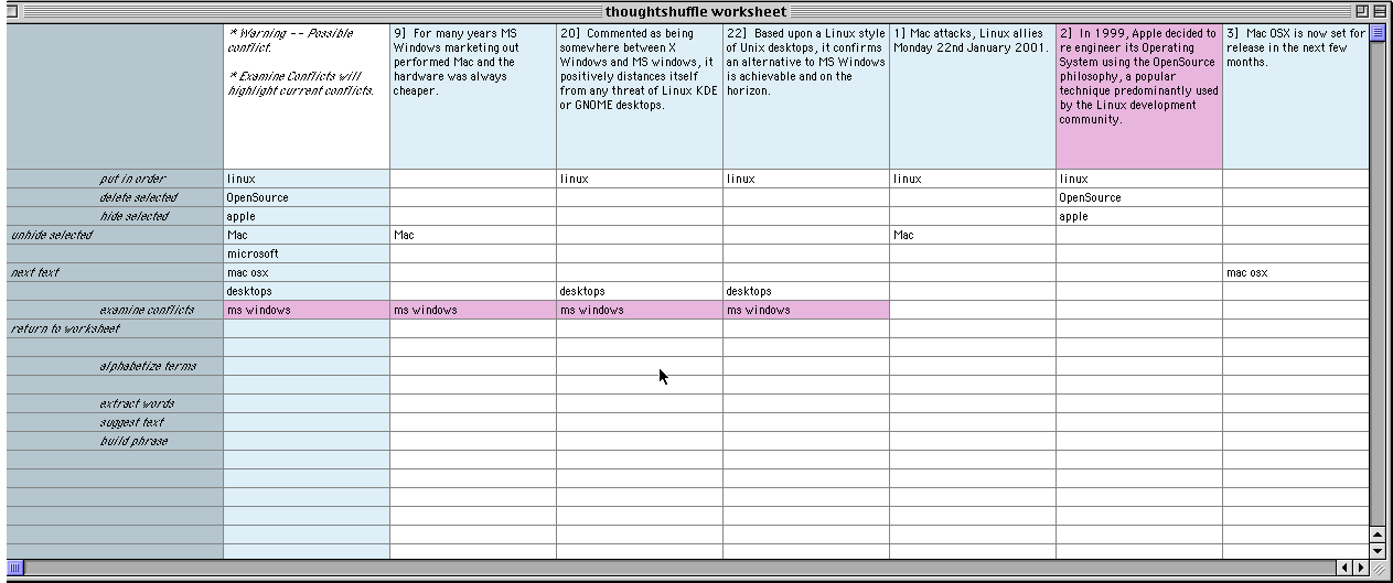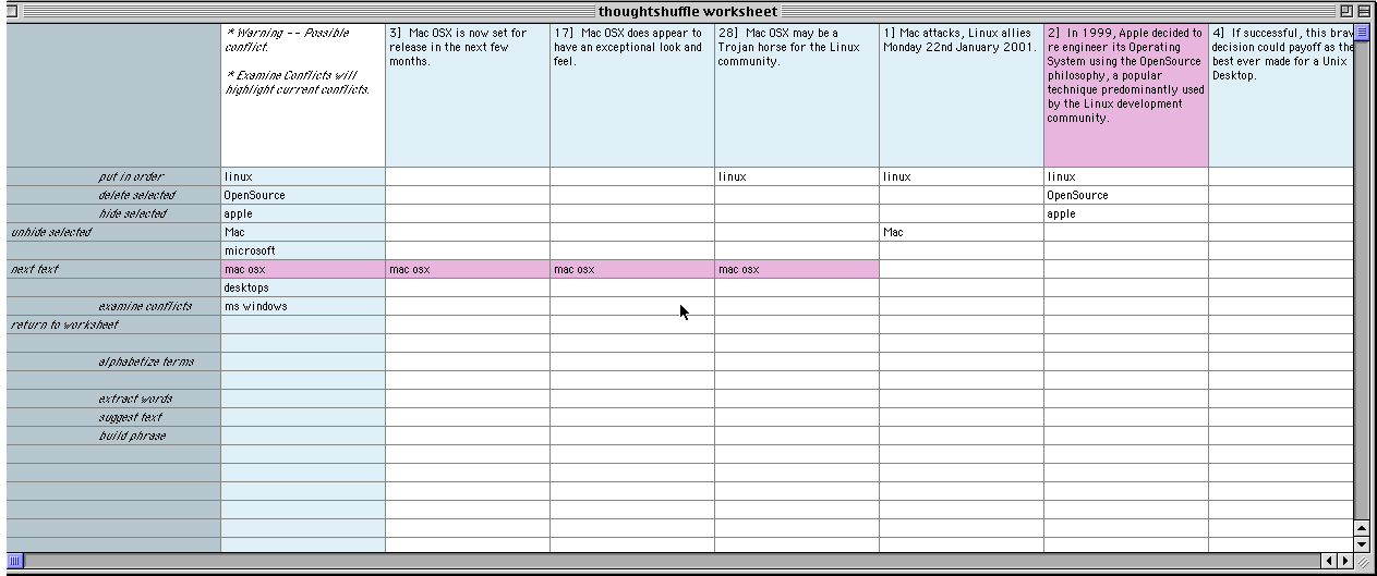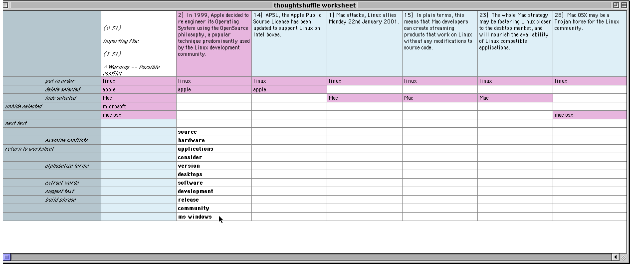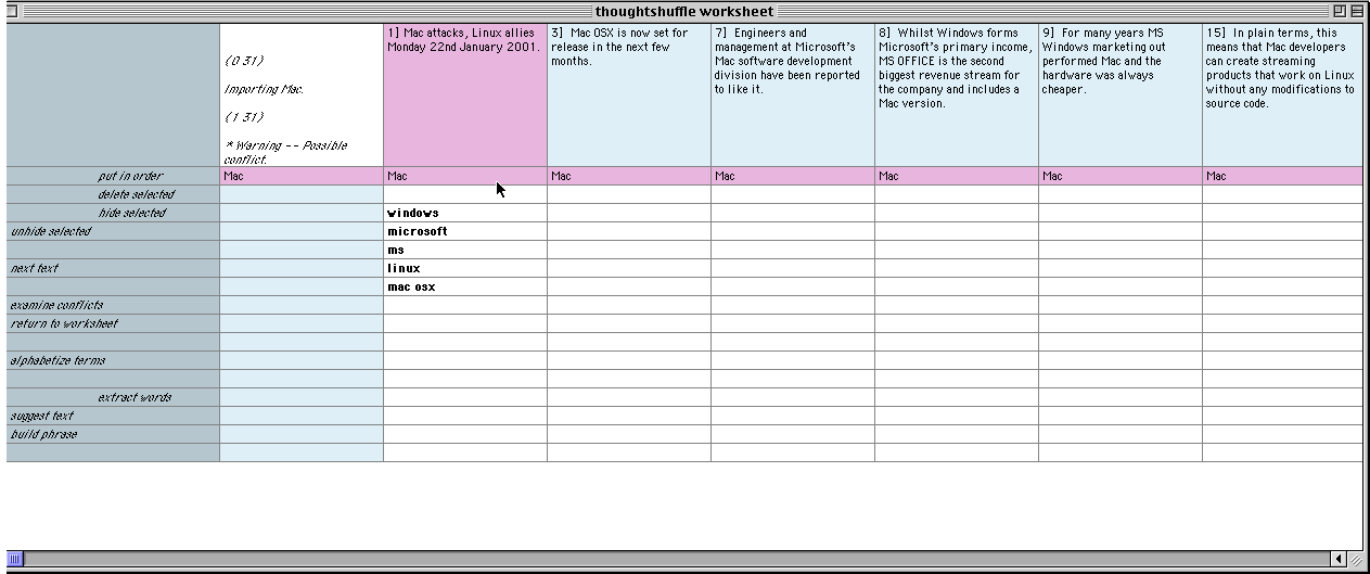 III. User has clicked on the word 'Mac' and Thought Shuffler imports it as a term into the light-blue column. Thought Shuffler re-orders texts to shuffle all those containing the term 'Mac' to the left.