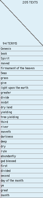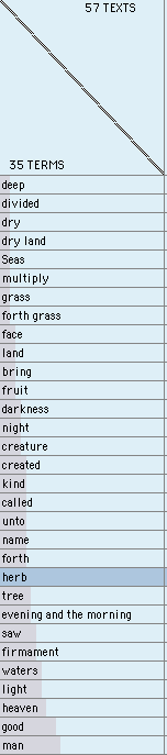 II. Auto Thought Shuffler seeking minimized terms in Genesis Chapters 1-2 (57 texts total), and then Chapters 1-10 (205 texts total).